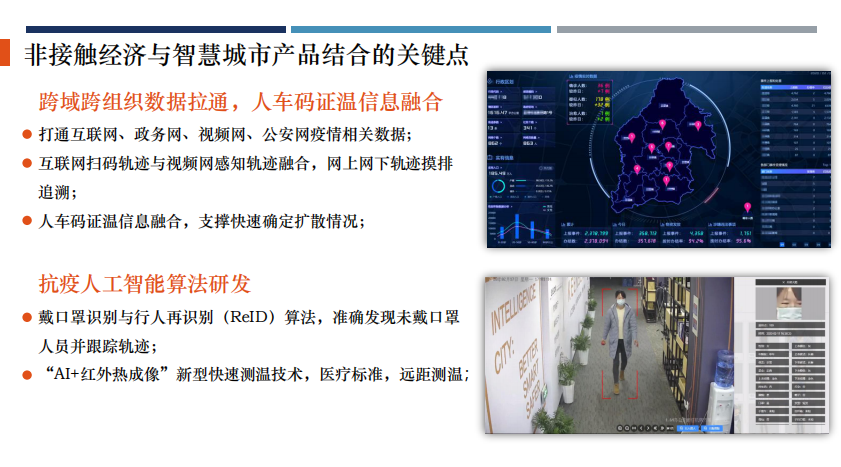 乐玩lewin科技智慧城市业务群产品经理袁名人分享了“非接触经济跟智慧城市新产品结合”的案例。“非接触型经济”已然崛起,其中的技术代表在对抗疫情过程中,发挥着重要的作用。数据采集,如测温、人脸等,加之与视频、地图等方面的融合,将在各个场景中达到非接触效果的最大化。而这些数字化、智能化的沉淀,正在以”非接触“的形式惠及更多的行业与社会公共事务。